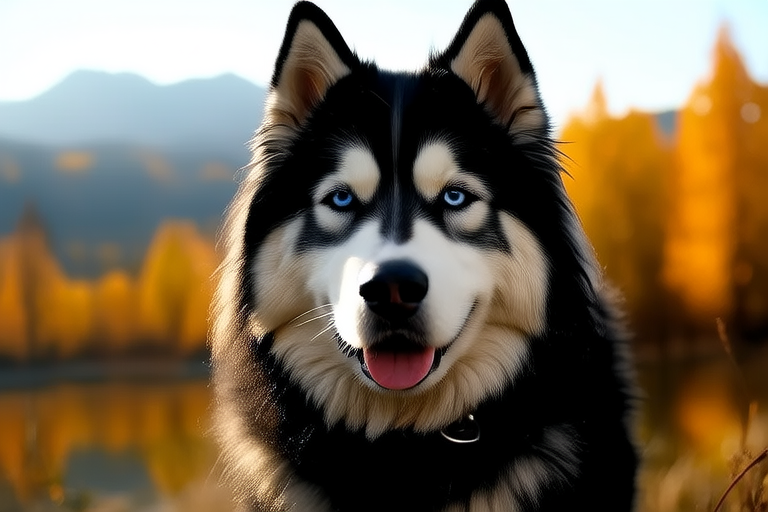 In this tranquil scene, a Siberian Husky rests in the golden light of a late afternoon sun. The dog lies on its side, head propped up on a paw, gazing into the distance. Its coat shimmers with a warm, amber hue, reflecting the sun’s rays. The soft light creates gentle shadows along its body, enhancing its elegant form. The dog’s eyes, half-closed in contentment, seem to convey a deep peace and satisfaction. The image captures the quiet moments of relaxation and tranquility that these dogs often enjoy, offering viewers a glimpse into the serene side of their lives.